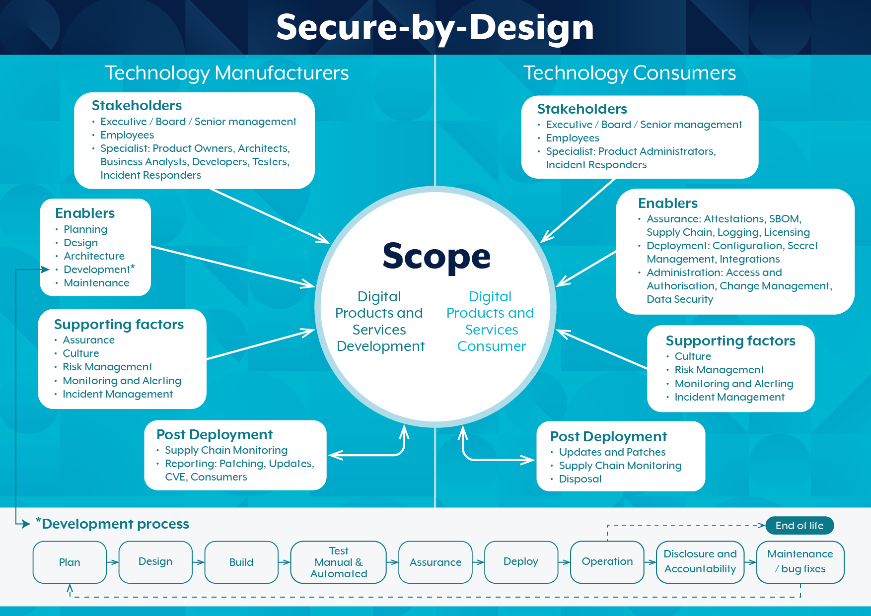 Turvaline ja turvalisusele suunatud lähenemine toodete ja teenuste disainile, arendamisele ja kasutuselevõtule, mis nõuab terviklikku organisatsioonilist lähenemist küberjulgeolekule. Turvaline jagamine nõuab, et küberohtusid kaalutaks algusest peale, et võimaldada leevendust läbimõeldud disaini, arhitektuuri ja turvameetmete abil. Selle põhiväärtus on kaitsta tarbijate privaatsust ja -andmeid vähema haavatavusega toodete ja teenuste kavandamise, arendamise ja pakkumise kaudu ning seejärel turvalisuse tagamise kaudu kogu nende elutsükli jooksul.
